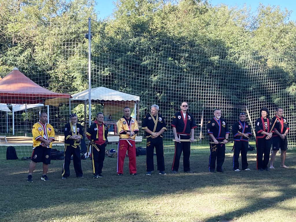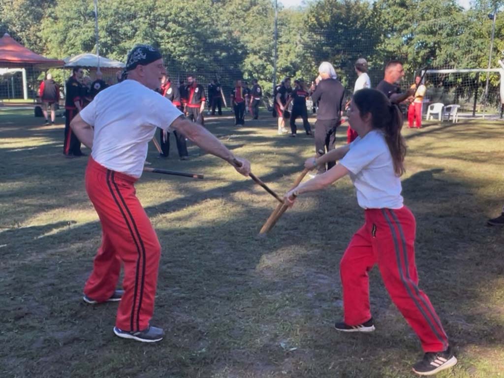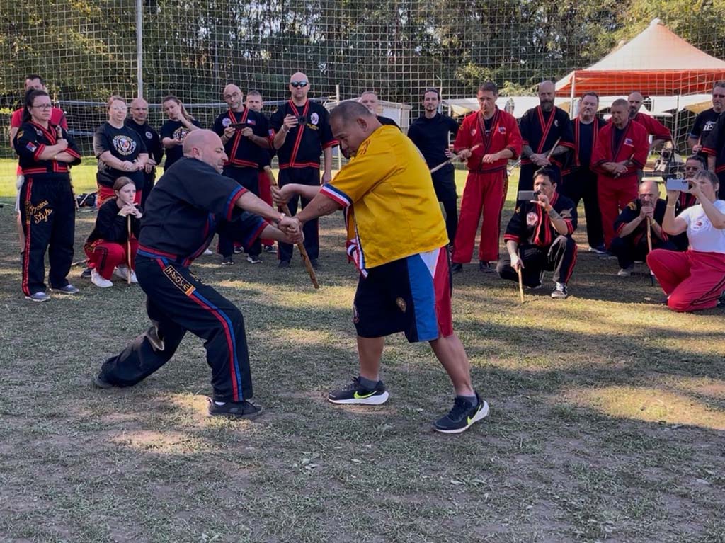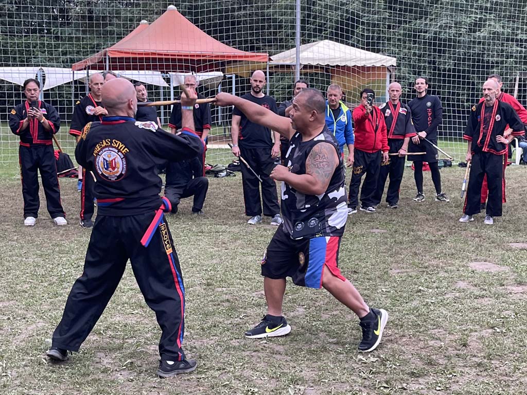 Am nächsten Tag trafen nach und nach Gruppen aus verschiedenen Ländern ein: Neben Deutschland und Italien waren auch Österreich, Polen, die Schweiz, Tschechien, Ungarn und die Philippinen vertreten (an Tag drei mit Grand Master Carlos de Leon sogar Südamerika). Schließlich versammelten sich rund 70 Teilnehmer auf dem Sportplatz des Camping Italia Lido. Nach einer dynamischen und effektiven Aufwärmeinheit mit Guro Dan Kroupa begann das erste Training. Unter der Leitung mehrerer Großmeister erhielten wir spannende Einblicke in unterschiedliche Techniken des Kombatan. Mit Grand Master Carlos Pulanco trainierten wir zunächst offenes Sinawali und halbes Sinawali. Der Fokus lag dabei auf Rhythmus, Koordination und präzisem Timing. Anschließend folgte eine Einheit bei Grand Master Ernesto Presas Jr., in der wir das Single-Cross-Sinawali sowie Single gegen X übten, erst statisch, dann in der Bewegung. Zum Abschluss des Tages unterrichtete Grand Master Randy Remolin Entwaffnungstechniken, die aus dem Single-Sinawali hervorgingen, darunter auch Hirada und Palis Palis. Die Sequenzen verlangten volle Konzentration und sorgten für einen dynamischen Abschluss des ersten Trainingstages.