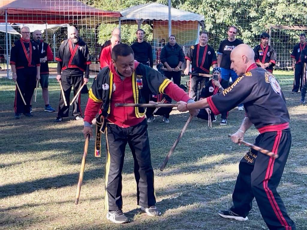 Am letzten Tag des Kombatan-Camps eröffnete nach einer Aufwärmrunde Senior Master Vincenzo Amabile den Tag mit einer Serie von Wirbeltechniken, die Geschick, Kontrolle und Koordination erforderten. Anschließend zeigte GM Remolin einen dynamischen Sinawali-Flow mit Doppelstock, der in der folgenden Sequenz um verschiedene Hirada-, Sumbrada-, Hebel- und Verriegelungstechniken ergänzt wurde. Diese erforderten ein gutes Gefühl für Timing und Distanz – und zeigten, wie vielseitig das Single-Sinawali als Grundlage für komplexe Techniken sein kann. Zum Abschluss des Camps unterrichtete GM Presas Hebeltechniken aus dem Single-Sinawali. Dabei lag der Fokus auf einer präzisen Ausführung und der sicheren Kontrolle des Partners.
