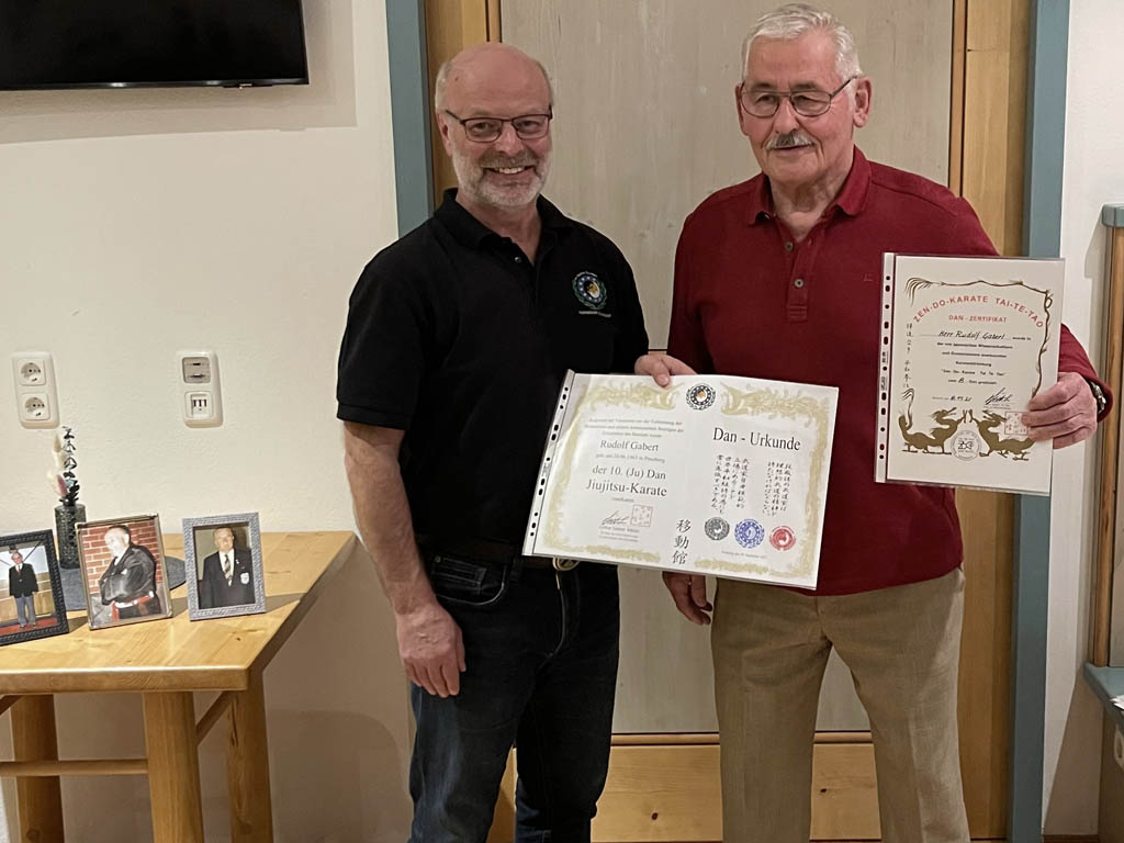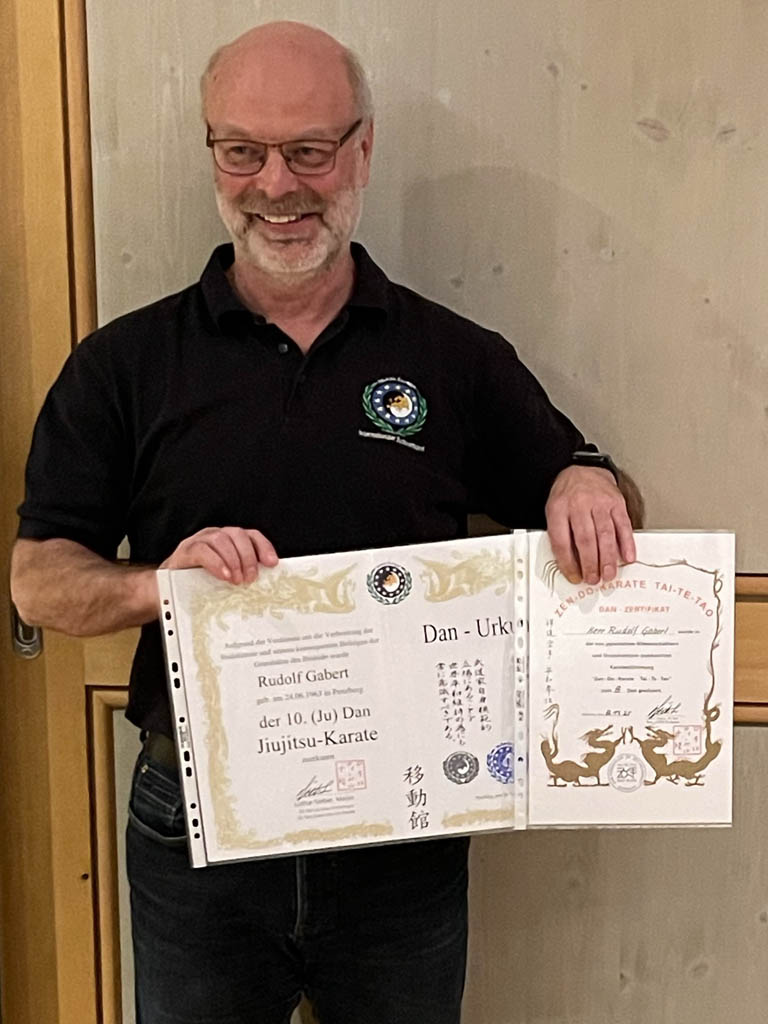 Im Wortlaut der am 08.11.2025 überreichten Urkunden wird „aufgrund der Verdienste um die Verbreitung der Budokünste und seinem konsequenten Befolgen der Grundsätze des Bushido“ Herrn Rudolf Gabert der 10. (Ju) Dan Jiu-Jitsu/Jiujitsu-Karate zuerkannt. Außerdem wird Rudolf Gabert der 8. Dan Zen-Do-Karate Tai-Te-Tao (einer von japanischen Wissenschaftlern und Großmeistern anerkannten Karatestilrich-tung) zuerkannt.